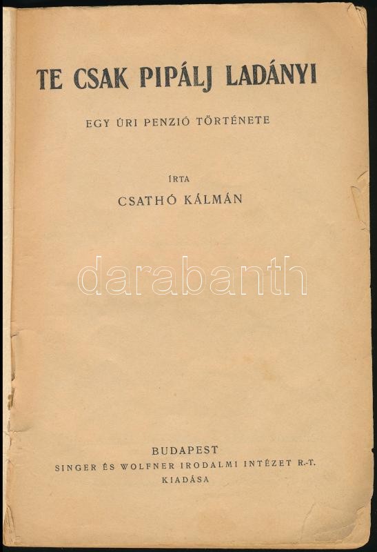 Csathó Kálmán: Te csak pipálj Ladányi. Egy úri penzió története. Milliók könyve 146. Bp.,1926,Singer és Wolfner. Kiadói papírkötés, szakadozott, kissé foltos borítóval, sérült gerinccel.
