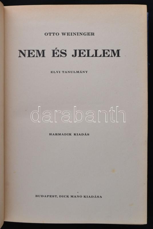 Otto Weininger: Nem és jellem. Elvi tanulmány. Fordította Gábor Andor.... https://www.darabanth.com/hu/349-Gyorsarveres/349.0/Konyvek/Konyvek-Tarsadalomtudomany~1500010/Otto-Weininger-Nem-es-jellem-Elvi-tanulmany-Forditotta-Gabor-Andor-Bp-en-Dick-Mano-Kia~II1960547