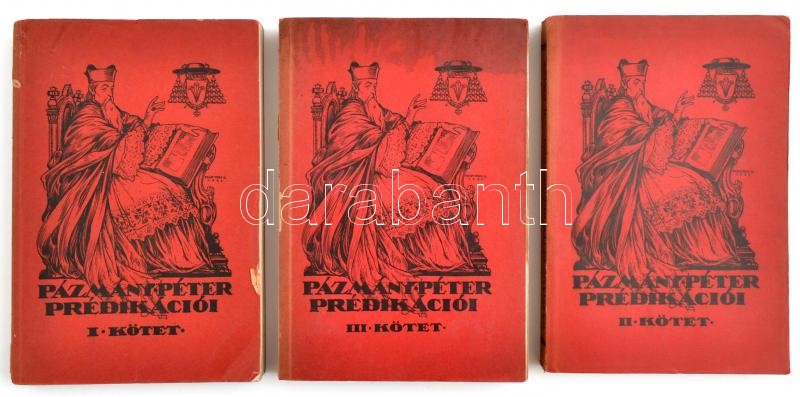 Pázmány Péter prédikációi I-III. kötet. Sajtó alá rendezte Dr. Petró József. A borító Márton Lajos munkája. Kiadja: Az Egri Egyházmegyei Irodalmi Egyesület. Eger, 1931, Egri Érseki Líceumi Könyvnyomda. Kiadói illusztrált papírkötés, a III. kötet foltos, a II. egyik sarkán kis hiánnyal, az I. és III. kötetek gerincén kis sérülésekkel,felvágatlan lapokkal.