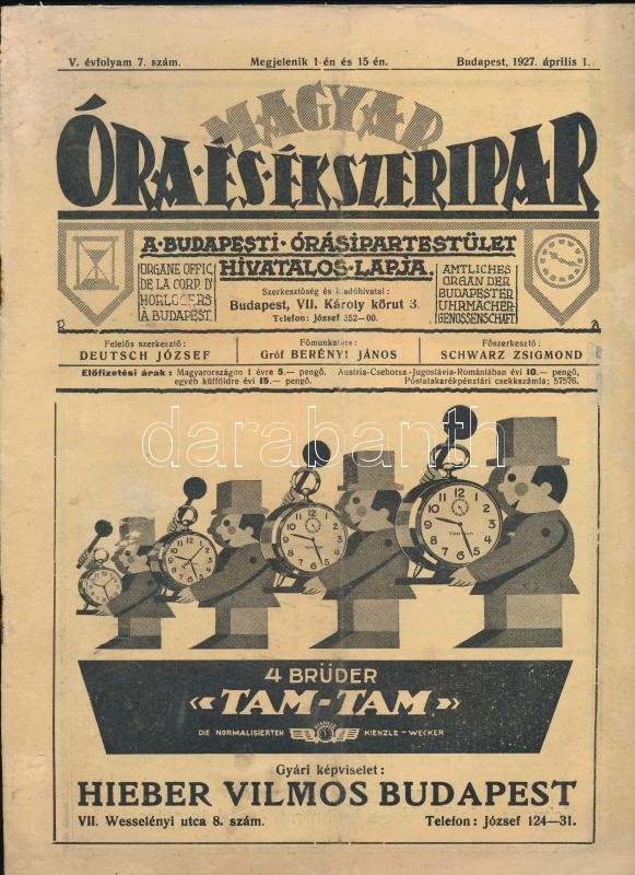 1927 Magyar Óra-, és Ékszeripar. V. évf. 7. sz. 1927. ápr. 1. Szerk.: ... https://www.darabanth.com/hu/349-Gyorsarveres/349.0/Mutargy-papirregiseg-egyeb/Nyomtatvanyok~500030/1927-Magyar-Ora-es-Ekszeripar-V-evf-7-sz-1927-apr-1-Szerk-Schwarz-Zsigmond-Papirk~II1984833