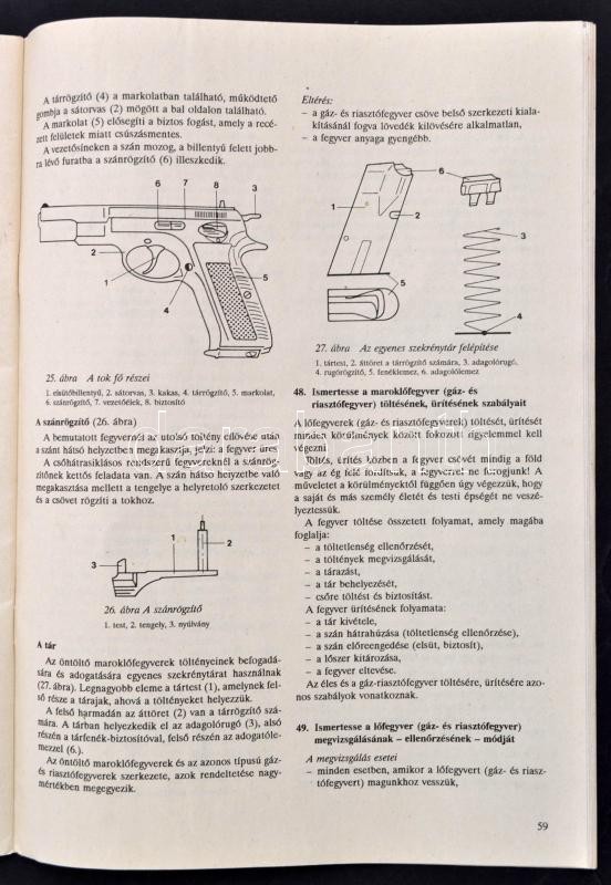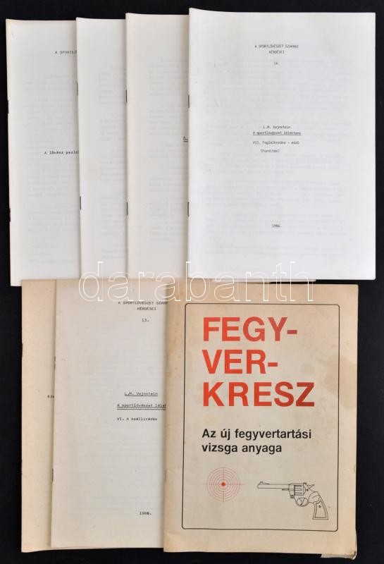 Leírás: cca 1986 7 db különféle fegyverekkel kapcsolatos nyomtatvány: fegyverkresz, sportlövészet lélektana, stb., tűzött papírkötésben