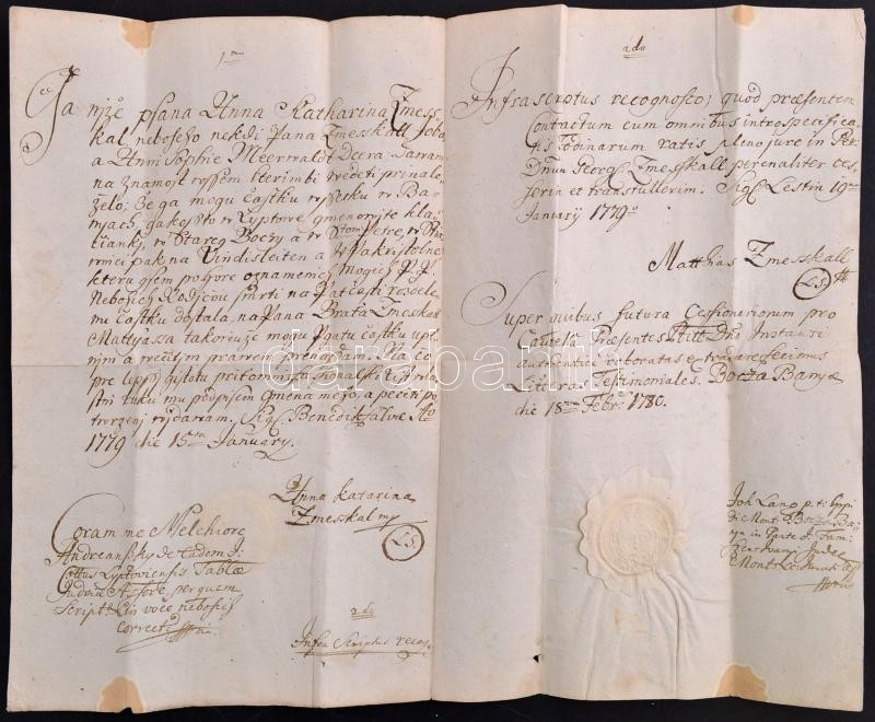 1780 A bóczabánya (ma: Vyšná Boca / Királyboca) bíró és esküdtek latin nyelvű oklevele a Zmeskal-család birtokügyében, szlovák nyelvű tanúságlevél átírásával, papírfelzetes rányomott pecséttel