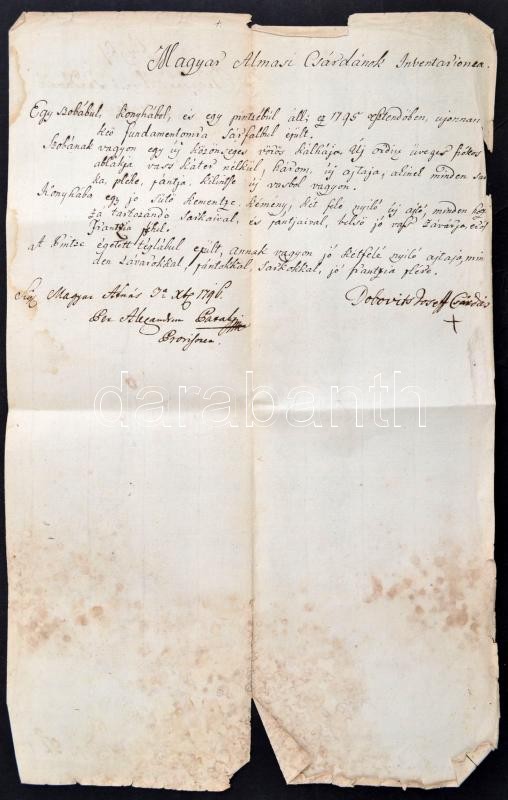 1794, 96 A magyaralmási csárda inventáriuma és a földek inventáriuma https://www.darabanth.com/hu/349-Gyorsarveres/349.0/Mutargy-papirregiseg-egyeb/Okmanyok~500017/1794-96-A-magyaralmasi-csarda-inventariuma-es-a-foldek-inventariuma~II1981955