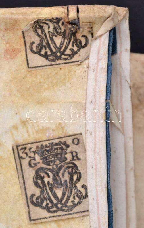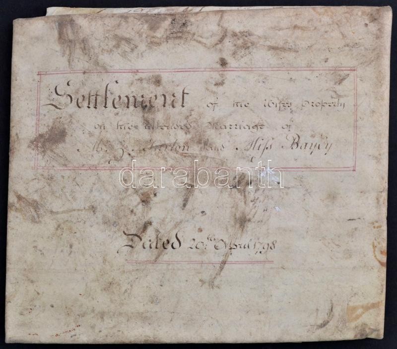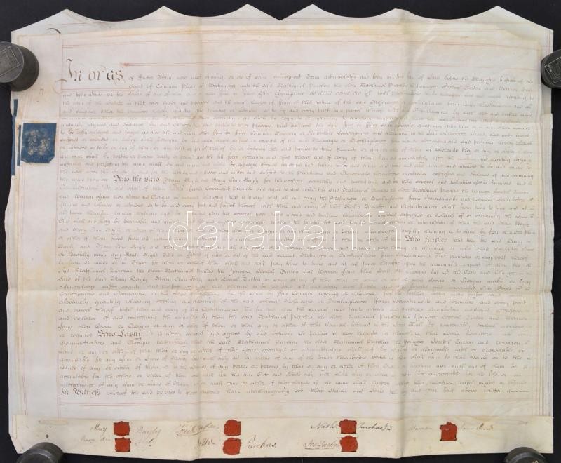 Leírás: 1798 Angol nyelvű szerződés (megegyezés) birtokügyben, pergamen, négy oklevél összefűzve, rányomott viaszpecsétekkel, okmánybélyeggel