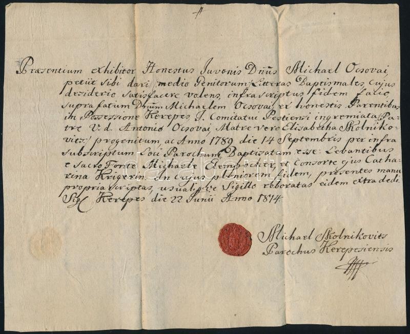 Leírás: 1814 Kerepes, latin nyelvű keresztelési anyakönyvi igazolás, rányomott viaszpecséttel