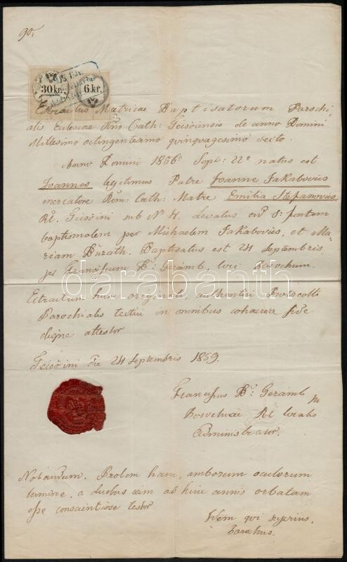 Leírás: 1859 Técső, római katolikus keresztelési anyakönyvi kivonat, latin nyelven, okmánybélyeggel, rányomott viaszpecséttel