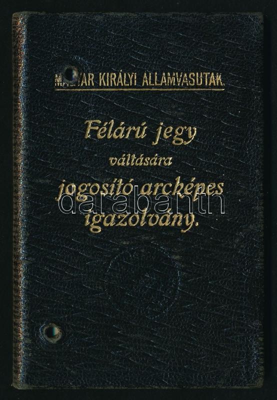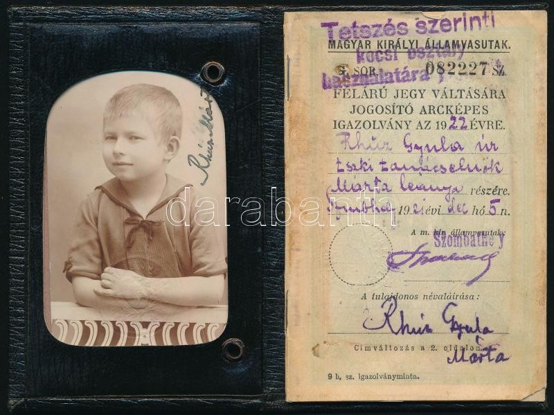 1922-1925 Szombathely, M. Kir. Államvasutak fényképes, félárú jegy váltására jogosító igazolvány, tetszés szerinti kocsiosztályra, törvényszéki tanácselnök leány gyermeke részére, egészbőr kötésben, jó állapotban.
