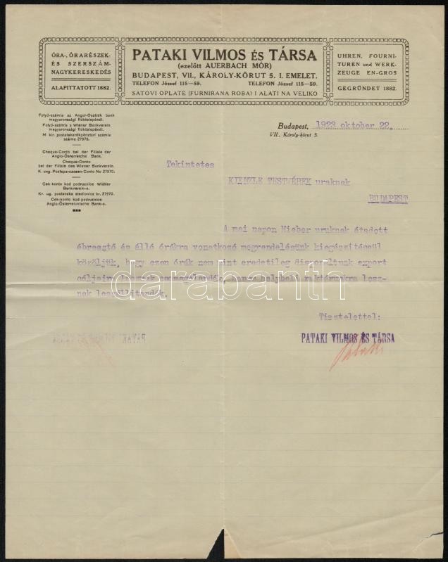 Leírás: 1923 Bp., Pataki Vilmos és Társa Óra- és Szerszámnagykereskedés fejléces levélpapírjára írt levél