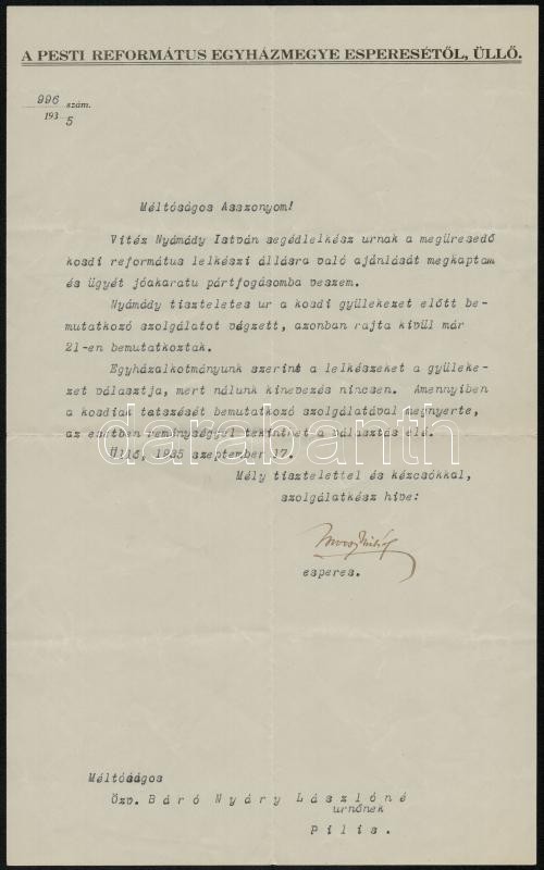Leírás: 1935 Üllő, a pesti református esperes levele özvegy báró Nyáry Lászlónéhoz a kosdi lelkész választása ügyében, gépelt, aláírt, fejléces papíron