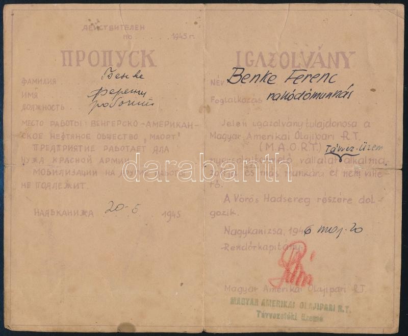 1946 M.A.O.R.T. igazolvány https://www.darabanth.com/hu/349-Gyorsarveres/349.0/Mutargy-papirregiseg-egyeb/Okmanyok~500017/1946-MAORT-igazolvany~II1982411