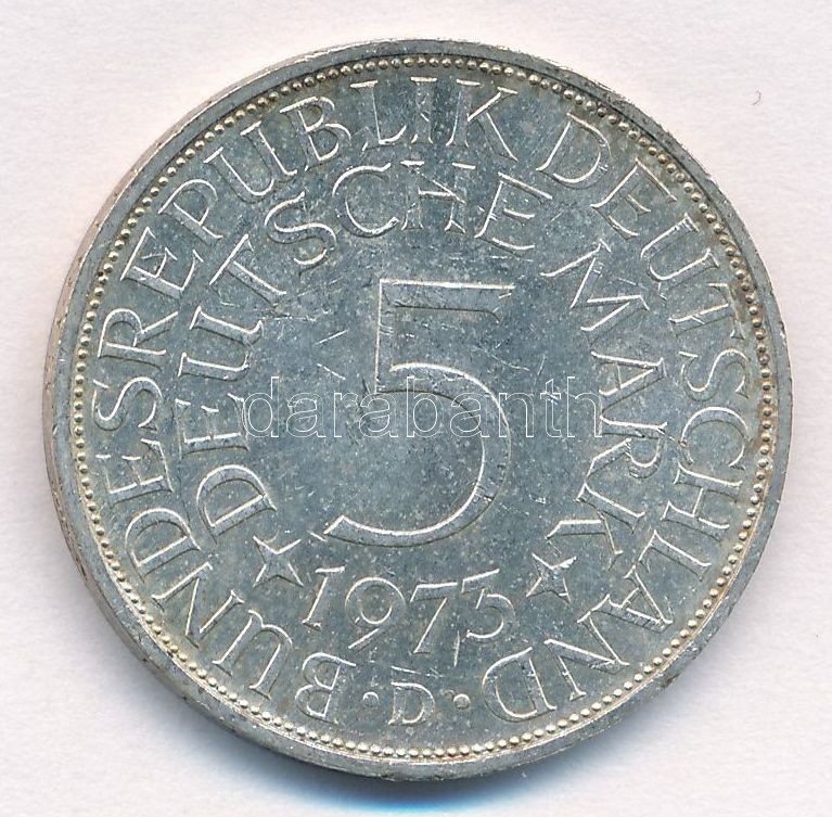 Krause KM#112.1 https://www.darabanth.com/hu/349-Gyorsarveres/349.0/Numizmatika/Kulfoldi-fem-es-ezustpenzek~1000012/NSZK-1973D-5M-Ag-T2--FRG-1973D-5-Mark-Ag-CXF-Krause-KM231121~II1970019