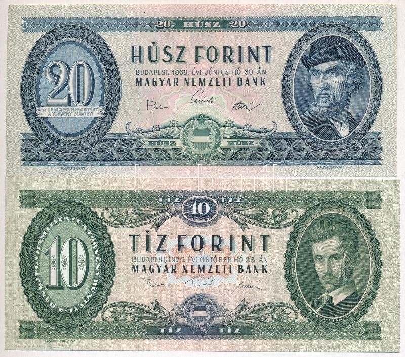 1969. 20Ft + 1975. 10Ft T:I,II https://www.darabanth.com/hu/349-Gyorsarveres/349.0/Numizmatika/Magyar-bankjegyek~1000006/1969-20Ft-plus-1975-10Ft-TI-II~II1982731