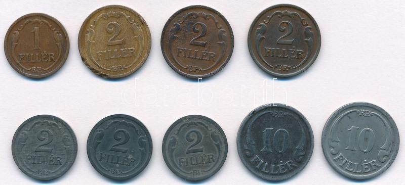 Leírás: 1933. 1f Br + 1933-1940 2f Br (3x) + 1943-1944 2f Zn (3x) + 1942 10f Fe (2x) T:-1,2 patina, durva ph. Adamo P1,P2,P2.3,P3.1