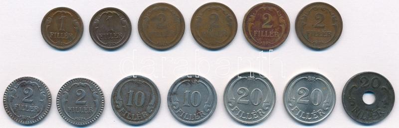 Leírás: 1936. 1f Br (2x) + 1928-1936. 2f Br (4x) + 1940. 2f Fe (2x) + 1940. 10f Fe (2x) + 1938. 20f Cu-Ni (2x) + 1944. 20f Fe T:1-,2,2- patina Adamo P1,P2,P2.2, P3.1,P4,P4.1