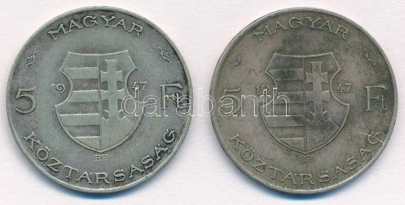 1947. 5Ft Ag "Kossuth" (2x) T:2-,3 patina Adamo F8.1 https://www.darabanth.com/hu/349-Gyorsarveres/349.0/Numizmatika/Magyar-es-magyar-verdejelu-fem-es-ezustpenzek~1000007/1947-5Ft-Ag-Kossuth-2x-T2-3-patina-Adamo-F81~II1984904