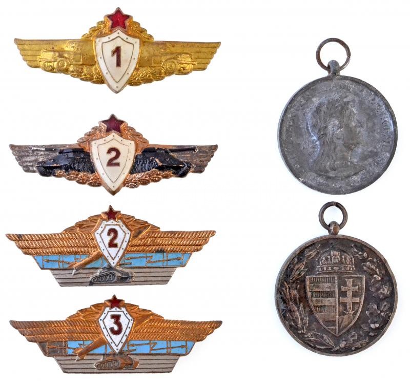 Leírás: 6db-os vegyes militárai tétel, közte harckocsizó jelvény, 1929. "Magyar Háborús Emlékérem" ezüstözött Br kitüntetés mellszalag nélkül, "BRONZ" fémjel peremen; 1940. "Erdélyi részek felszabadulásának emlékére" cink emlékérem mellszalag nélkül. Szign.:BERÁN T:2,2-