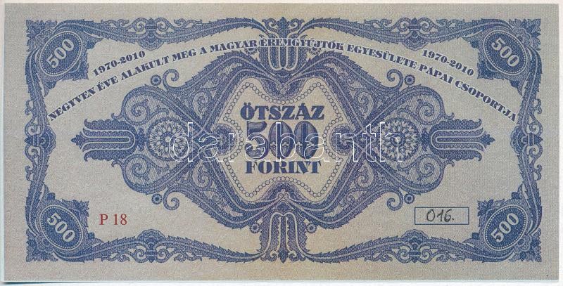 Pápa 2010. "MÉE Pápai csoport / 29. Bakonyvidéki Éremgyűjtő találkozó" 500Ft alkalmi pénz, "II. kiadás / Érvényes: 10. Pápai Érem és Fegyverbörze napján, 2010. augusztus 15-én" felülbélyegzéssel, "P18-016" T:I
