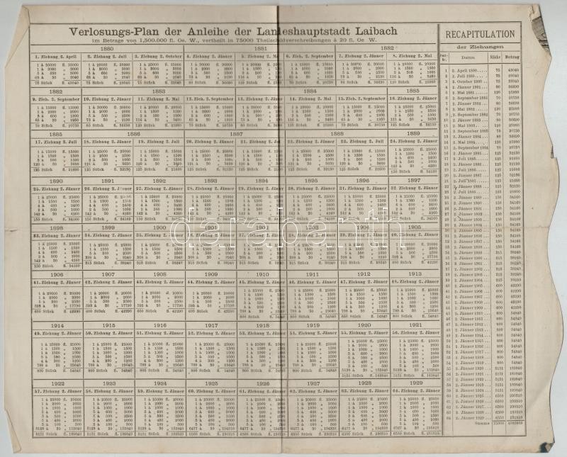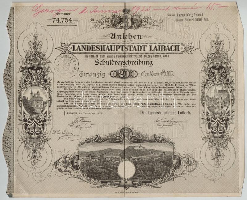 Ausztria / Laibach 1879. "Landeshauptstadt Laibach" kölcsön kötvény 20 Osztrák értékű Guldenről, szárapzecséttel T:III