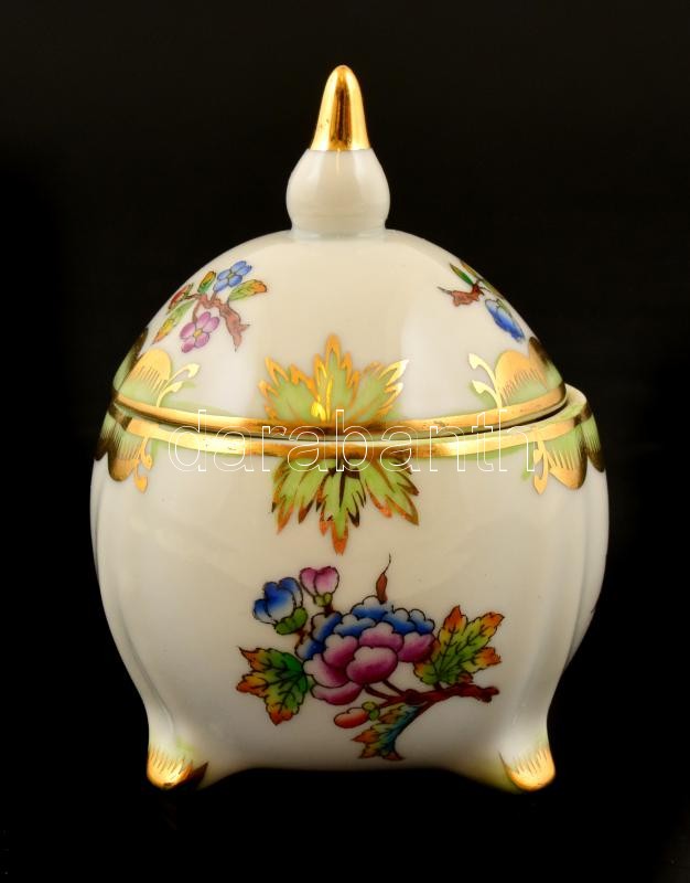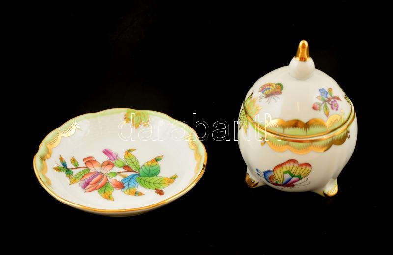 Leírás: Herendi Viktória mintás kis tálka + kis bonbonier, kézzel festett, jelzett, kis kopásnyomokkal, d: 9 cm, m: 8,5 cm