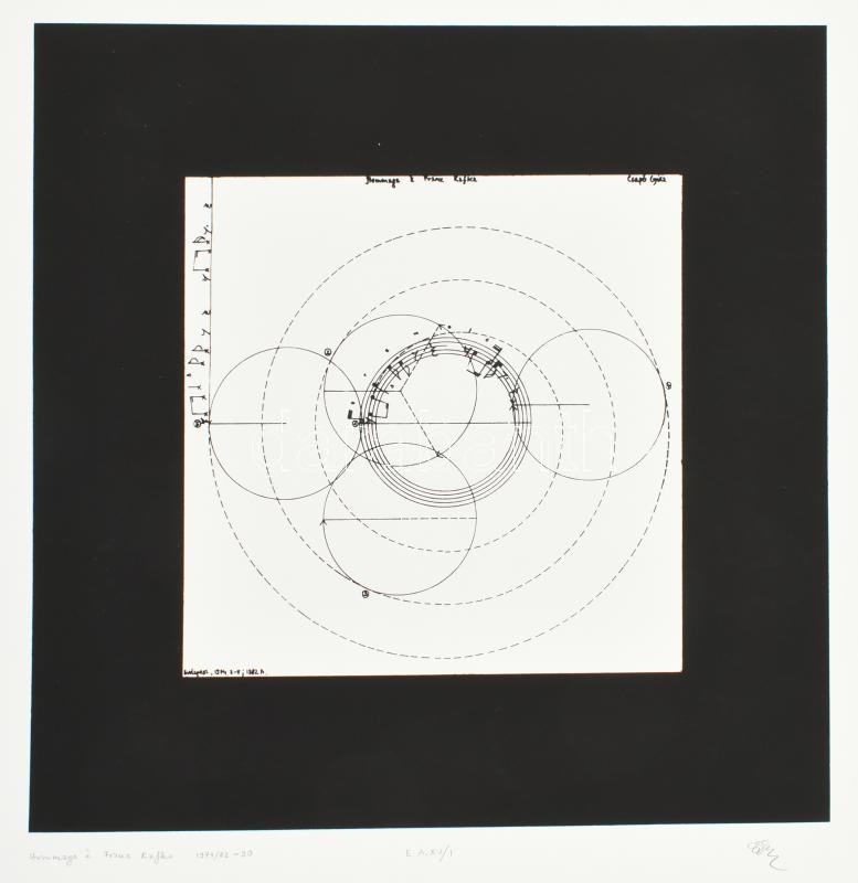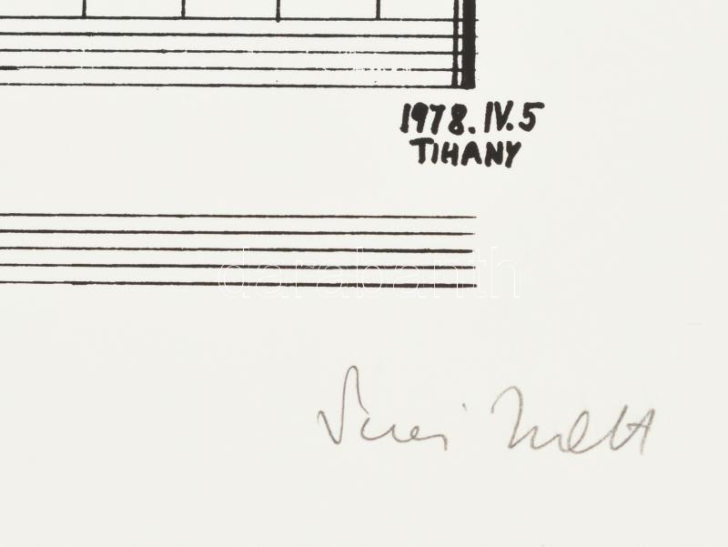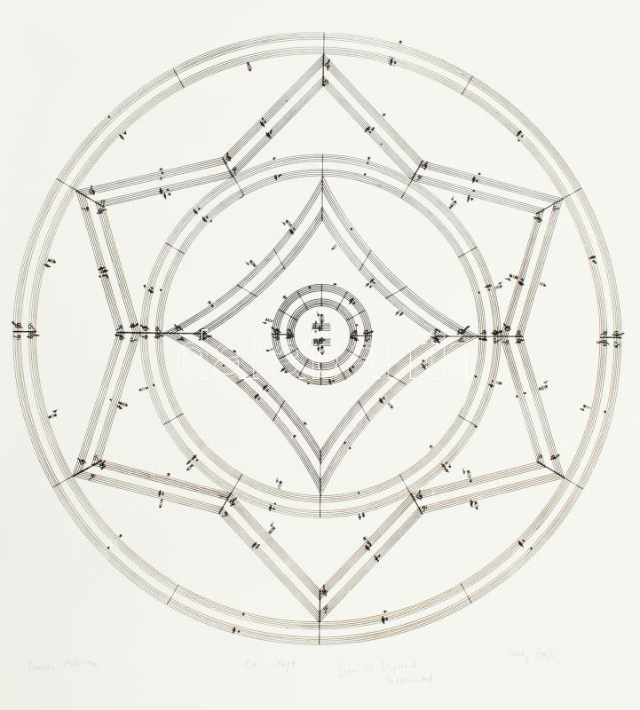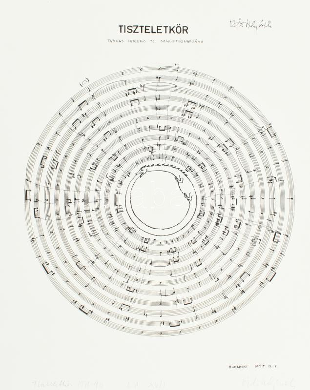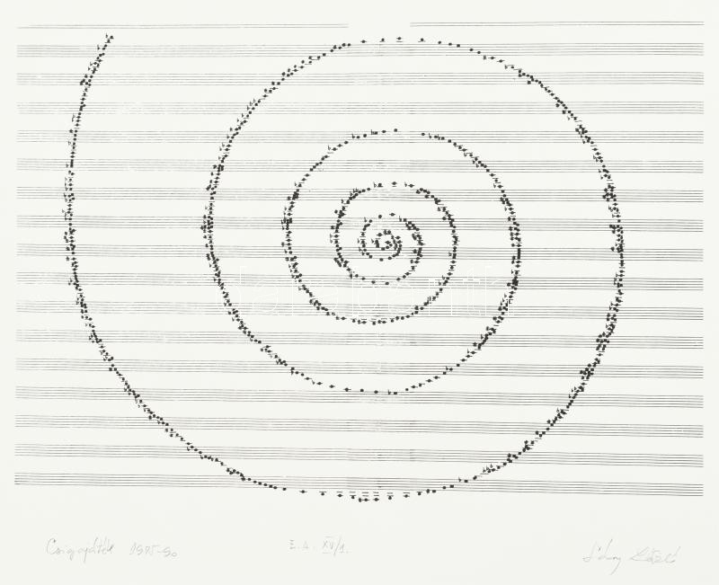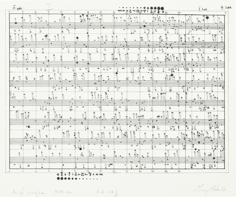 7 db, a Budapesti Új Zenei Stúdió zeneszerzőinek munkáit tartalmazó, ő általuk rajzolt és írt, kottaszerű szitanyomatot tartalmazó mappa: Új Zenei Stúdió. Első Antológia. Na-ne Galéria. 1990, Budapest. A művészek és művek felsorolása, az összes lap E.A XV/I (!) számozással: Csapó Gyula (1955-): Hommage á Franz Kafka, 1974/2-90, jelzett, 33x33 cm + Jeney Zoltán (1943-2019): Yantra, 1972-90, jelzett, autográf ajánlási sorokkal, d: 42 cm + Sáry László (1940-): Csigajáték, 1975-90, jelzett, 28,5x40,5 cm + Vidovszky László (1944-): Tiszteletkör, 1975-90, jelzett, d: 30,5 cm + Sáry László (1940-): Az ég virágai, 1973-90, jelzett, 26x34 cm + Serei Zsolt (1954-): ...midőn épp alszik, 1978-90, jelzett, 30x42 cm. Közreadja. Wilheim András. Terv: Bachman Gábor. Kiadó: Na-Ne Alapítvány és Bachman Gábor, Golovics Lajos, Rajk László. A mappa 12 lappal lenne teljes, 5 lap hiányzik. Vászonkötésű mappában. Hozzá tartozik: Rytmische Übungen 1981.II.10 c. nyomat. Készült 100 példányban 1990 december 14-én a Computer Kotta Képek kiállítás megnyitóján, Na-Ne galéria, Institut Francais en Hingrie, computer program: "R" Kft. Tudomásunk szerint kereskedelmi forgalomba nem került. Rendkívüli gyűjtői ritkaság.