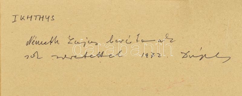 Drégely László (1932-1990): IKHTHYS, 1972 (Hal és egyéb motívumok). Vegyes technika, vászon. Jelzett. Hátoldalán autográf ajándékozási sorokkal Németh Lajos (1929-1991) Széchenyi- és Munkácsy Mihály-díjas művészettörténésznek 1972-ből. Üvegezett, sérült fa keretben, 34,5×25,5 cm / Mixed technique on canvas. Signed. With autograph dedication lines on the reverse.