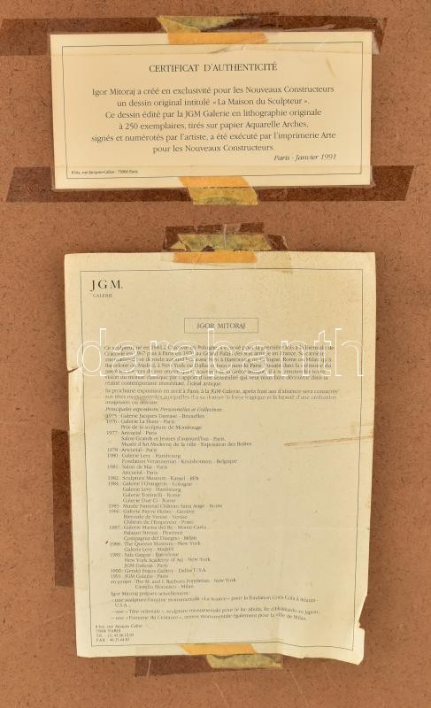 Igor Mitoraj (1944-2014): La maison du sculpteur, 1991. Litográfia, papír, jelzett. Számozott: 235/250. Hátoldalán JGM Galerie, Párizs eredetiséget igazoló tanúsítványával. Üvegezett keretben, üveg jobb felső sarka sérült.. 68,5×40 cm / Igor Mitoraj (1944-2014): La maison du sculpteur, 1991. Litography on paper, signed. Numbered: 235/250. With certificate of authenticity of JGM Galerie, Paris on the reverse. Framed, the glass is broken in the upper right corner. 68,5×40 cm.