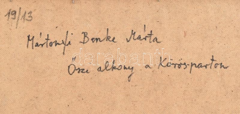Leírás: Mártonfi Benke Márta (1958-): Őszi alkony a Körösparton, 2019. Olaj, farost, jelzett. Hátoldalán autográf felirattal. Fa keretben. 50x60 cm / Oil on wood fibre, signed, framed