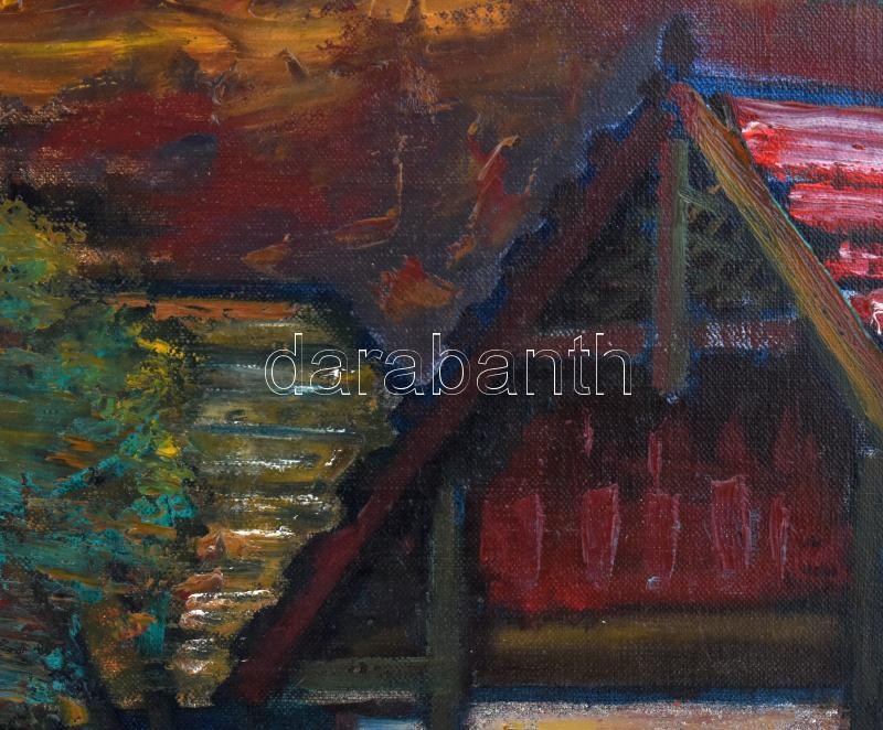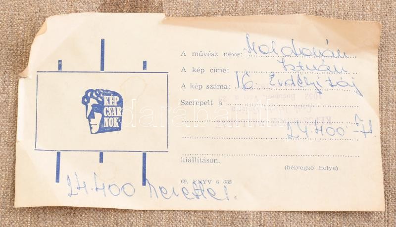 Moldován István (1911-2000): Erdélyi táj. Olaj, vászon, jelzett. Hátoldalán Képcsarnok Vállalat címkéjével. Fa keretben. 60×80 cm / István Moldován (1911-2000): Transylvanian landscape. Oil on canvas, signed. Framed. 60×80 cm
