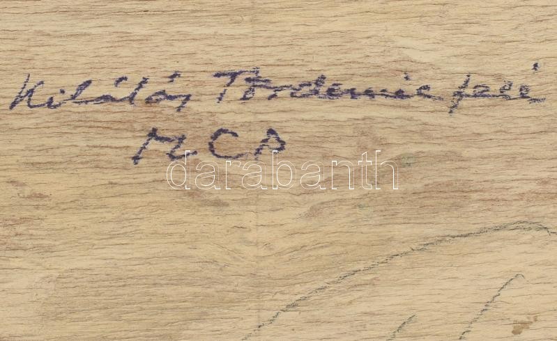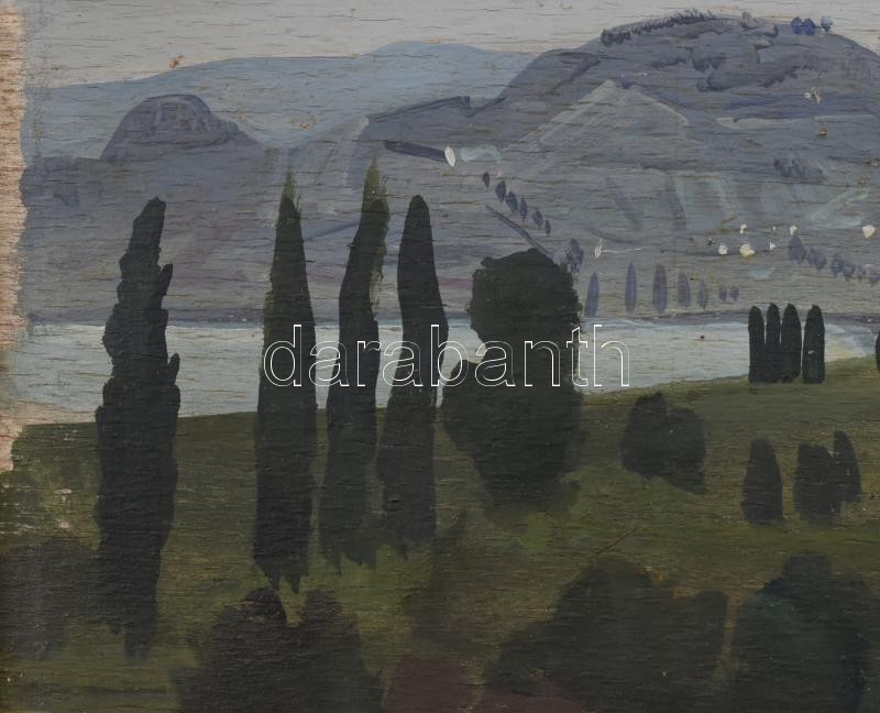 Molnár C. Pál (1894-1981): Kilátás Tördemic felé (Badacsonytördemic). Olaj, falemez, jelzett. Hátoldalán feliratozott valamint Képző- és Iparművészeti Társulat bélyegzőjével. Fa keretben, 26,5×36 cm / Molnár C. Pál (1894-1981): Panorama of Tördemic (Badacsonytördemic). Oil on wood, signed. With description and stamp on the reverse. Framed, 26,5×36 cm
