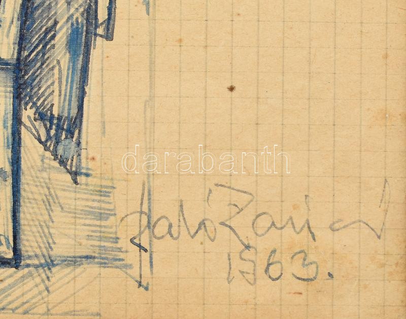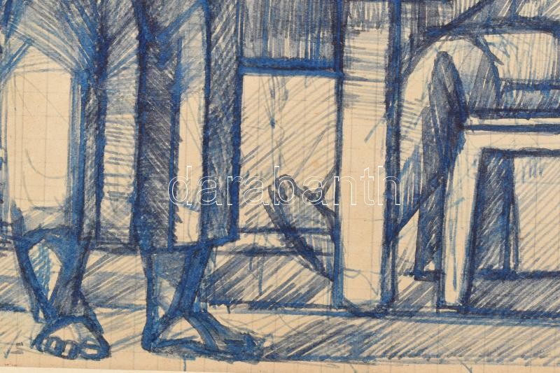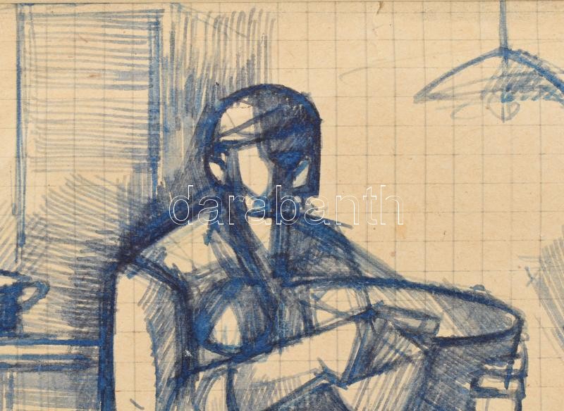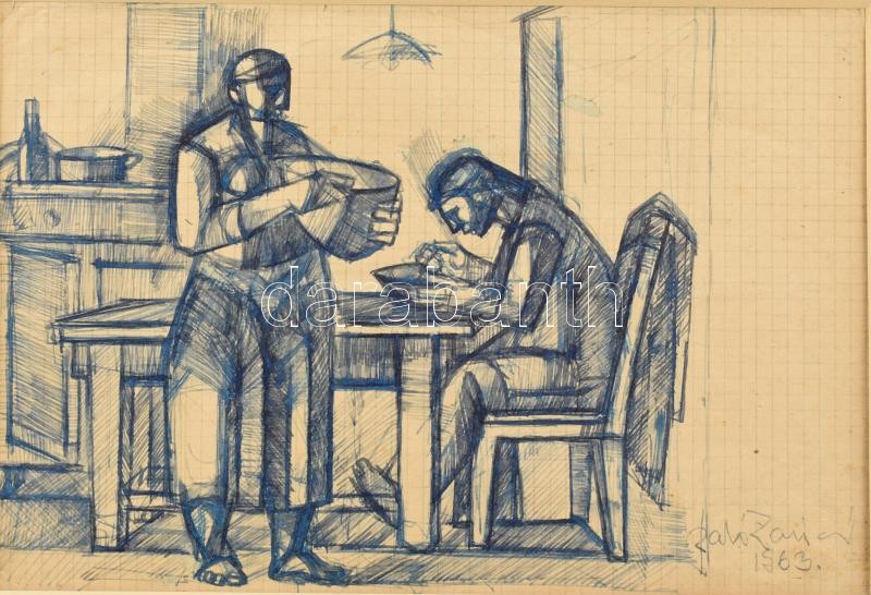 Szabó Zoltán, Angyalföldi (1929-2014): Vacsora közben, 1963. Golyóstoll, papír. Jelzett. Paszpartuban. Lap szélén apró szakadással. 20x28 cm / Ballpoint pen on paper, signed. With very small tear on the edge of the paper.