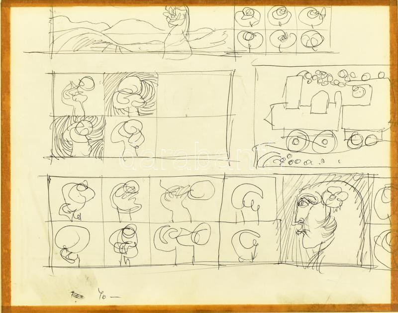 Szász Endre (1926-2003), kétoldalas mű: Szürreális jelenet (hátoldalán tanulmányok). Tus, akvarell, papír, jelzett. Üvegezett fa keretben. Lap széle kissé foltos. 20x25,5 cm