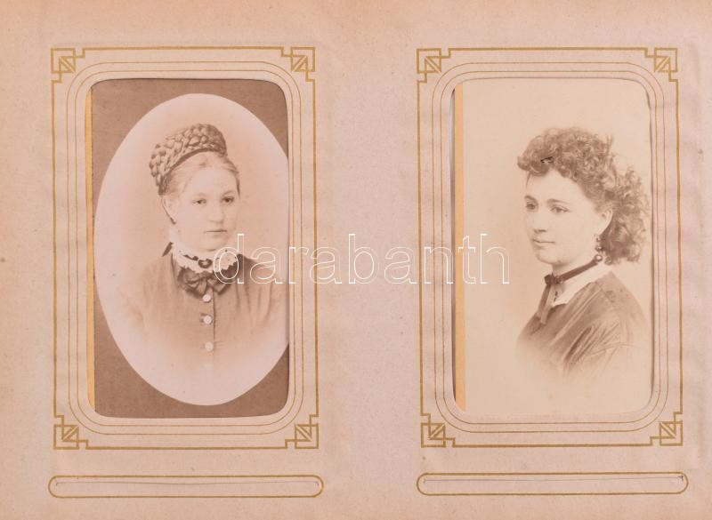 cca 1860-1890 Nemesi család fotóalbuma, feltehetőleg erdélyi vagy erdélyi kötődésű család hagyatékából, 70 db fotó portré fotó, rajta azonosításra váró személyekkel, benne kolozsvári Veress Ferenc, Tauffer Gyula, Marselek F, Brassó, Samuel Herter, Marosvásárhely, Ciehulski P., Ciehulsi és Wargha, Arad, Weisz Testvérek, Segesvár, Ludwig Schuller és más erdélyi műtermekből származókkal, de benne egy-két román műtermekből származókkal (Bucuresci, Franz Duschek, Bucarest Charles Szatmári (Szatmári Pap Károly)), de benne budai, pesti, bécsi, nem jelölt műtermek ...stb. munkáival is. Viseltes állapotú bőr fotóalbumban, különféle, de nagyrészt vizitkártya méretű fotókkal.