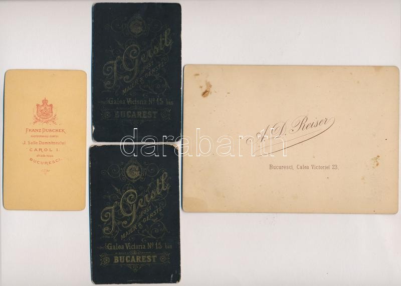 cca 1880-1900 Vegyes fotó tétel, 6 db, portré fotók, közte egy sír fotóval, keményhátú fotók román műtermekből (Bukarest, 2 db Franz Mandi/Mandy, 2 db J. Gerstl, (Bucuresi) A. D. Reiser, (Bucuresi) Franz Duschek), a kartonokon kisebb kopásnyomokkal, 16x11 cm és 10x6 cm közötti méretben/ cca 1890-1990 6 pieces of board photos from Bucharest, mainly portrait photos, one grave photo, Bucharest, 2 pc. Franz Mandi/Mandy, 2 pc. J. Gerstl, Bucuresci, A. D. Reiser, Franz Duschek, between 16x11 cm and 10x6 cm