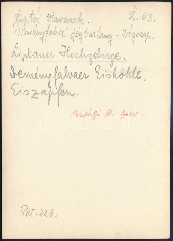 cca 1910 Liptói-hegyvidék, Deményfalvi-völgy, Erdélyi Mór felvétele, hátulján feliratozva, 11,5×16 cm / cca 1910 Demänovská Dolina, Dobšinská ľadová jaskyňa, Nízke Tatry, with notes on its back, 11,5×16 cm