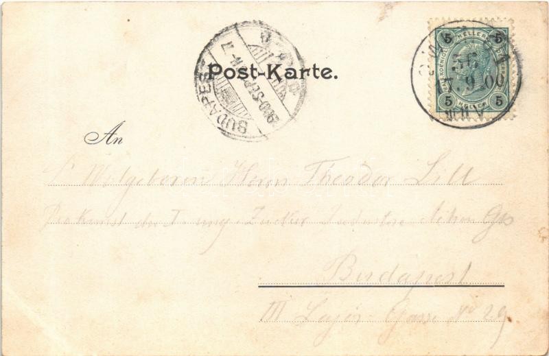 1900 Schneeberg, Hotel Hochschneeberg, Hengstberg, Kaisersein, Schneebergbahn. Mit Herz und Hand fürs Alpenland. Xilogr. Anst. v. J.J. Malcher Art Nouveau, floral
