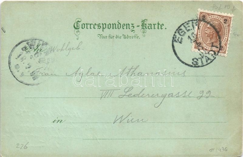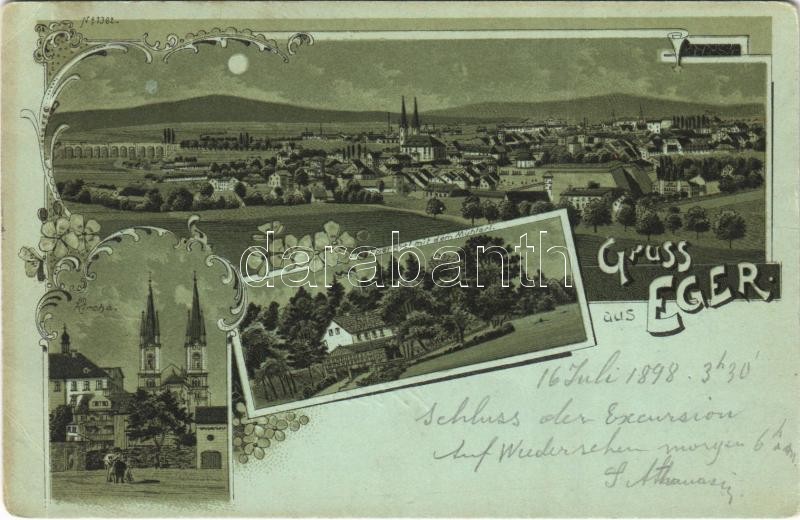 Leírás: 1898 (Vorläufer) Cheb, Eger; Kirche, Egerthal mit dem Mühlerl / church, valley, mill. Art Nouveau, floral, litho (EK)