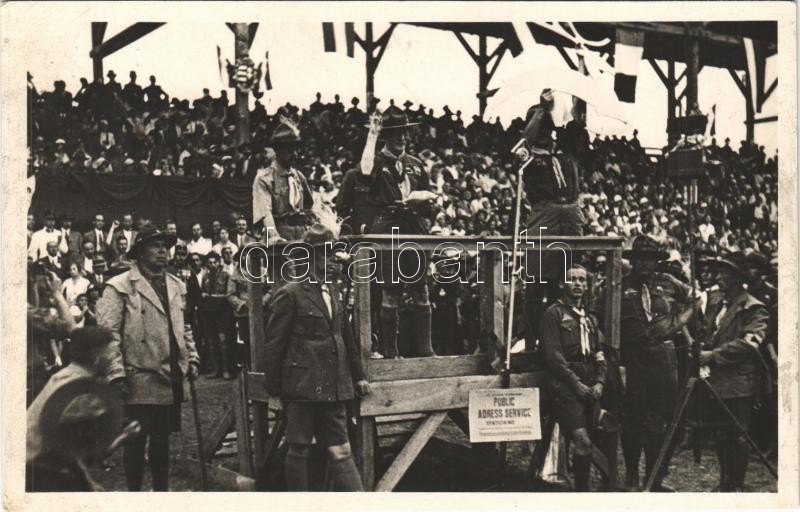 1933 Gödöllő, 4. Cserkész Világdzsembori, Robert Baden-Powell (Bi-Pi) beszédet mond, előtérben a Fehér Szarvas képe "Public Adress Service" / 4th World Scout Jamboree, speech of Robert Baden-Powell (Bi-Pi), image of the White Stag + So. Stpl