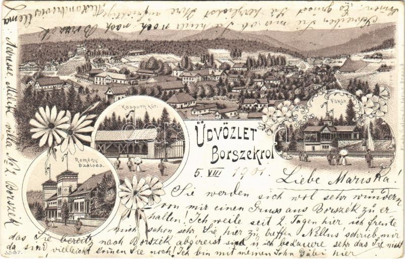 Leírás: 1901 Borszék, Borsec; Remény szálloda, Kossuth kút, Főkút / hotel, spring wells. Art Nouveau, floral, litho (EK)