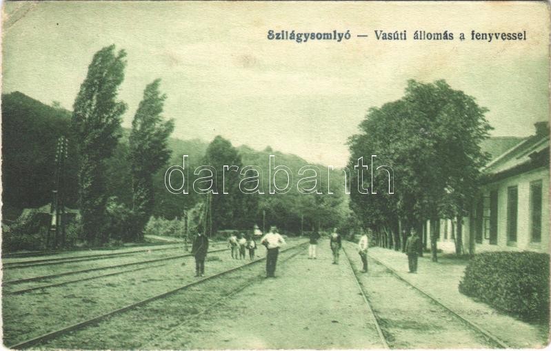 Leírás: 1918 Szilágysomlyó, Simleu Silvaniei; vasútállomás a fenyvessel / railway station with pine woods (EK)