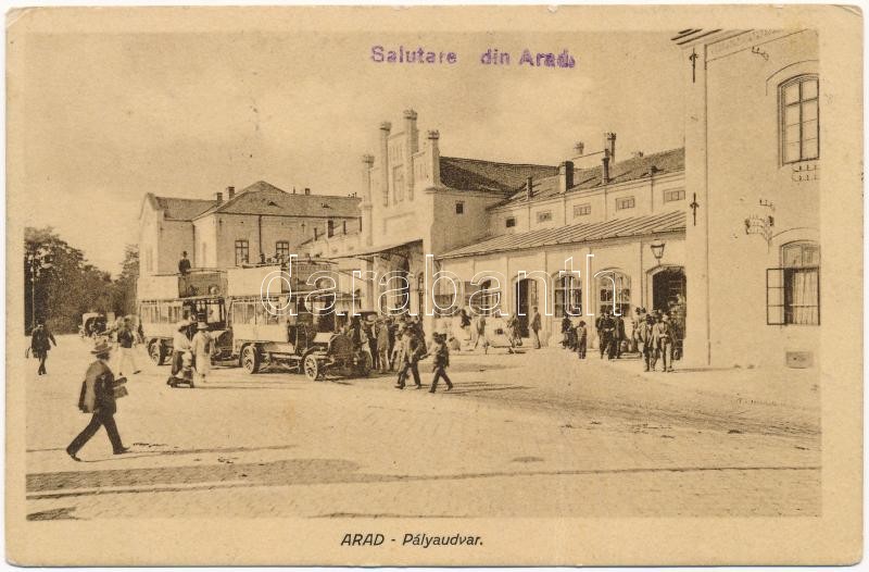 Leírás: Arad, TVV (Tiszavidéki Vasúttársaság) vasútállomása, pályaudvar, autóbuszok / railway station, autobuses (fa)
