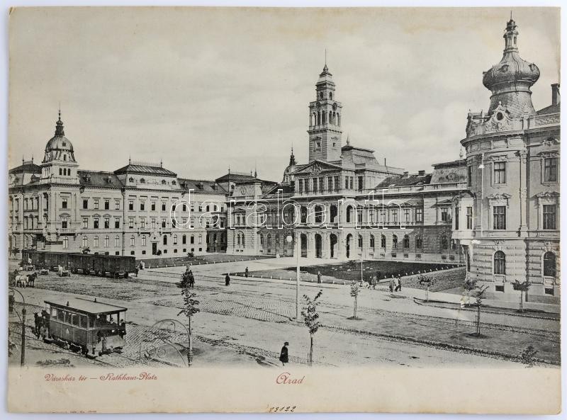Arad, Városház tér, városi vasút vonata és lóvasút, Gazdasági Takarékpénztár. Óriás képeslap / square, savings bank, urban railway, train, horse-drawn tram. Giant postcard (31 x 23 cm) (EK)