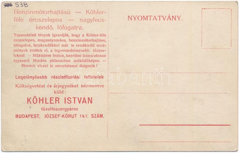 Kolozsvár, Cluj; Köhler-féle nagy benzinmotor hajtású fecskendő bemutató próbája, tűzoltókocsi. Köhler István tűzoltószergyáros reklámja a hátoldalon / firefighter's truck advertisement