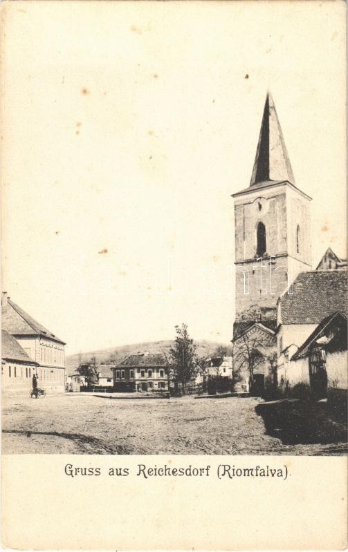 Leírás: Riomfalva, Reichersdorf, Richis; tér, erődtemplom / square, castle church