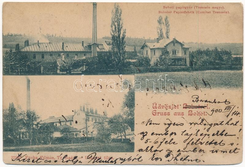 1900 Bobót, Bobot (Trencsén, Trencín); papírgyár. Fuchs Vilmos kiadása... https://www.darabanth.com/hu/35-Nagyaukcio/35.1/Kepeslapok/Felvidek~14668/1900-Bobot-Bobot-Trencsen-Trencin-papirgyar-Fuchs-Vilmos-kiadasa-paper-factory-EK~II2335003