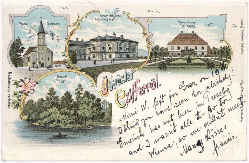 1902 Cífer, Czifer, Cziffer, Biksárd; templom, Gróf Zichy kastély, Kis kastély, Tósziget. Hermann Klein kiadása / church, castles, lake island. Art Nouveau, floral, litho (EK)