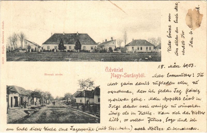 1903 Nagysurány, Surany; Hosszú utca. Schwarcz Jakab kiadása / street https://www.darabanth.com/hu/35-Nagyaukcio/35.1/Kepeslapok/Felvidek~14668/1903-Nagysurany-Surany-Hosszu-utca-Schwarcz-Jakab-kiadasa-street~II2363936