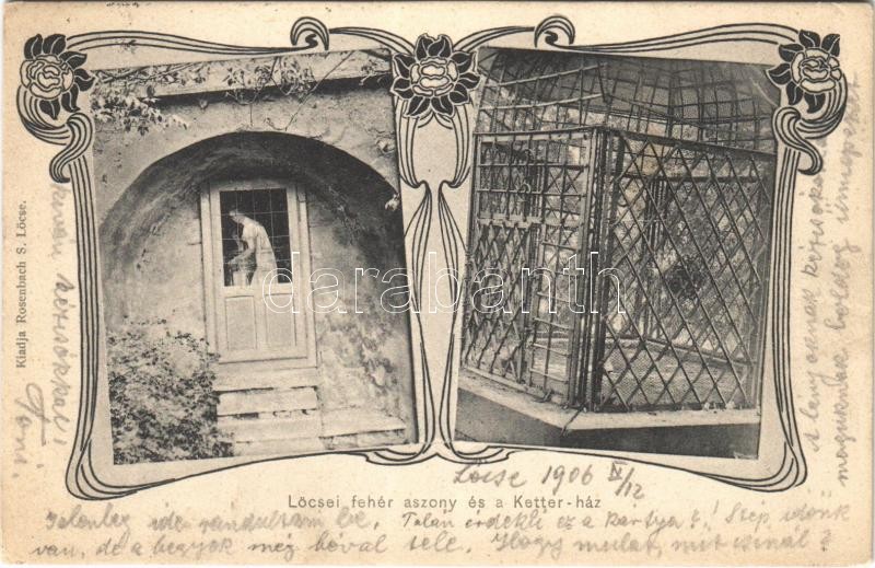 Leírás: 1906 Lőcse, Levoca; Lőcsei fehér asszony és a Ketter ház (szégyenketrec). Rosenbach S. kiadása / Julianna Géczy and the cage of shame. Art Nouveau