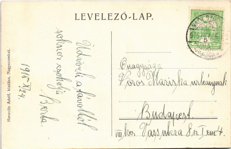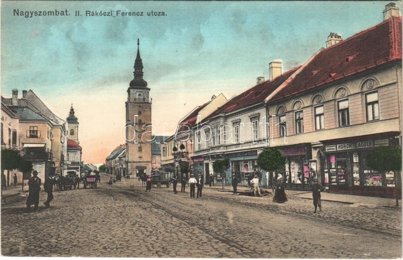 1915 Nagyszombat, Trnava; II. Rákóczi Ferenc utca, torony, Horovitz Adolf, Bernfeld Lipót, Kalenda üzlete, kávéház. Horovitz Adolf kiadása / street, tower, shops, cafe