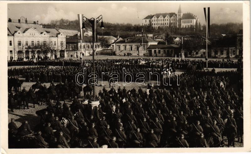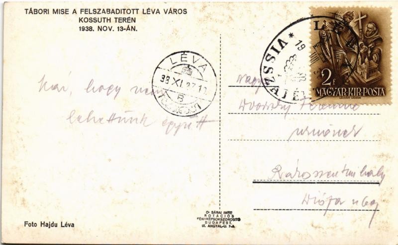 1938 Léva, Levice; bevonulás, tábori mise a Kossuth téren, Knapp Dávid üzlete és Szenessy vendéglő / entry of the Hungarian troops, camp mass on the square, restaurant, shop + "1938 Léva visszatért" So. Stpl (fl)