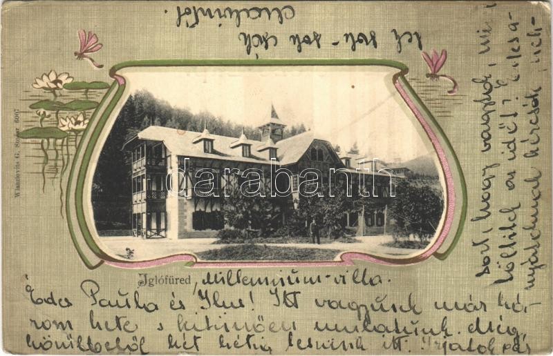 Leírás: Iglófüred, Spisská Nová Ves Kupele, Novovesské Kúpele; Millenium nyaraló. Wlaszlovits G. 6007. / villa. Art Nouveau, floral, litho (Rb)